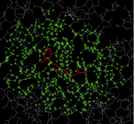 In some instances you may only want to display or select only a subset of a structure. For example you may only wish to display the residues surrounding a ligand (as shown below (ligand red; graphical selection green crosses). The "Selecting Neighbors" option selects the residues within a shpere of a defined radius. There are two ways of selecting neighbours to a particular atom or residue in ICM. Either by right clicking on the atom or residue in the graphical display or by right clicking in the ICM workspace.