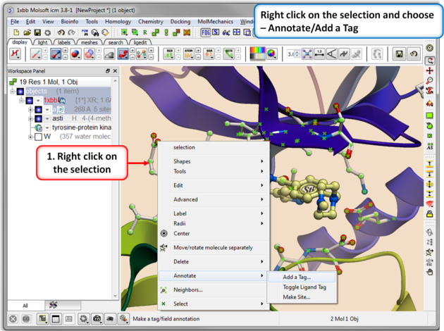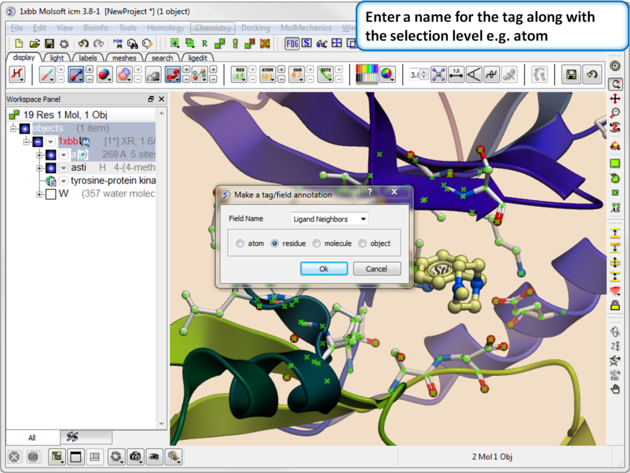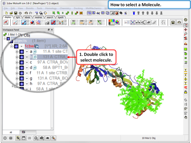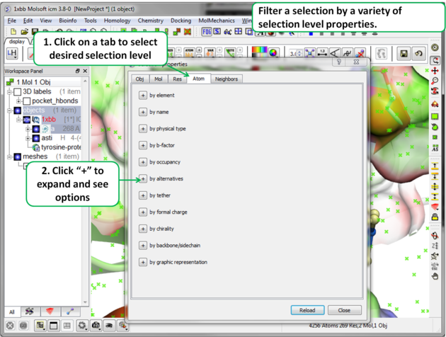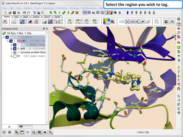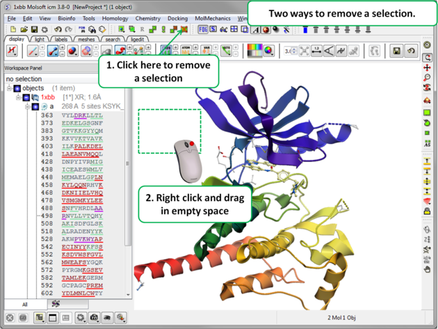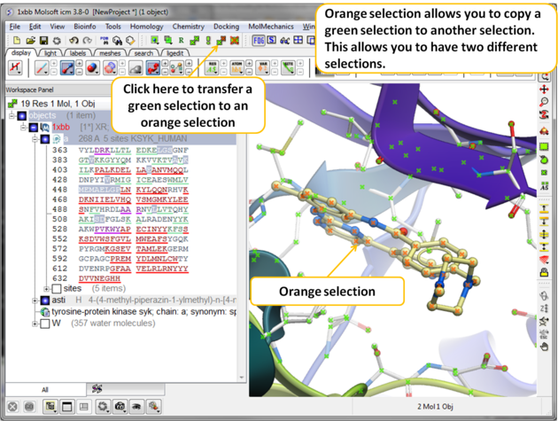There will be many occasions when you will have to make selections. For example, if you want to display a particular region or molecule contained within your protein structure or if you want to select residues around a binding pocket. If you have a molecule displayed in the graphics window, then selections will be displayed as green crosses. The selection you have made is also displayed at the top of the ICM Workspace. It is always a good idea to keep an eye on what is selected and what is not. There are four basic levels of selection