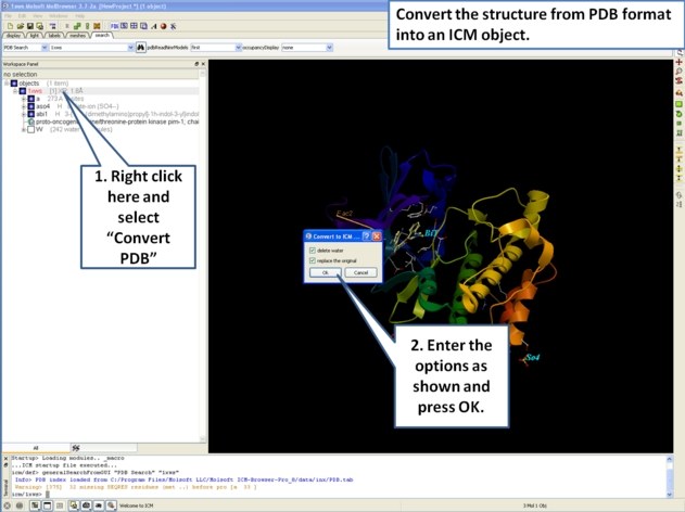 - Next, we will convert the PDB file to an ICM object so we can make slides of the ligand-receptor hydrogen bonds and binding pocket surface.