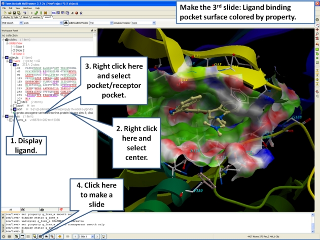 - Next, we will make a slide of the surface of the ligand binding pocket colored by binding property.