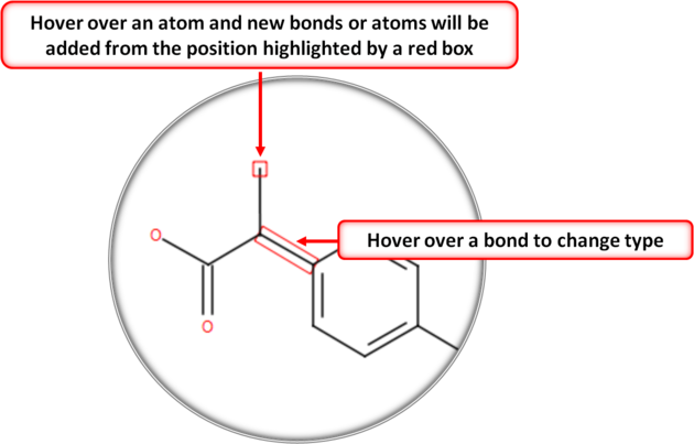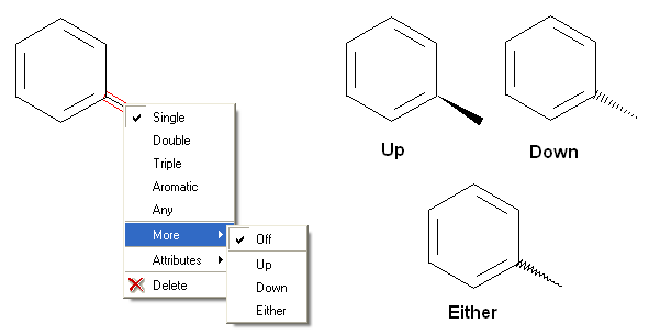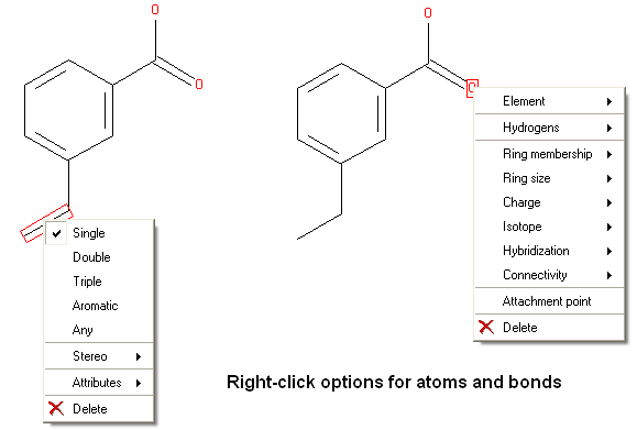 There are a number of different options available when you right click on a bond or atom. These can be used for editing bond and atom types and there are additional options for Chemical Searching.