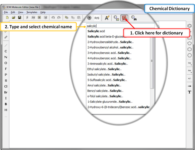 There is an inbuilt chemical dictionary which enables you to import a 2D sketch quickly. To use it: