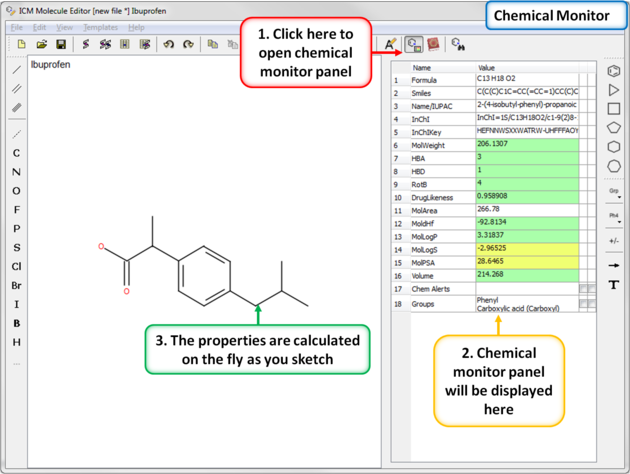 When drawing a compound in ICM you can monitor important ADME-Tox and drug-likeness properties.