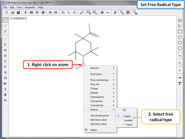 To set a free radical type (singlet, doublet or triplet) to an atom: