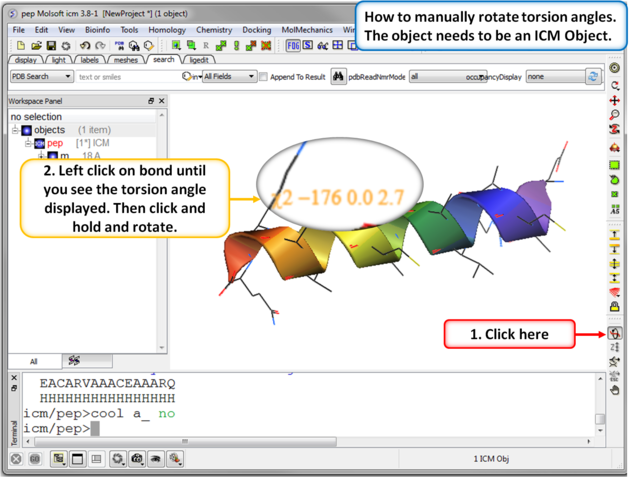 - Click on the bond until you see the torsion angle displayed in yellow (see image below). Click and hold on the bond around which you wish to rotate a residue. The changing torsion angle will be displayed in orange.