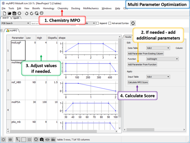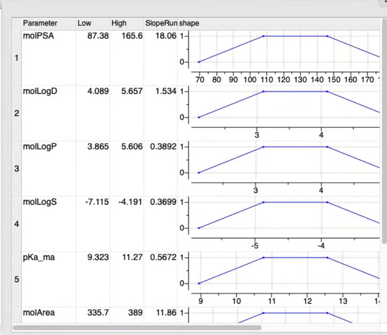 [ Customized Score | Binary Classification ] Multi Parameter Optimzation (MPO) is a method that can be used to derive a score for the relative importance of a number of different chemical properties. You can create your own scores or use the ones built into ICM: For example: