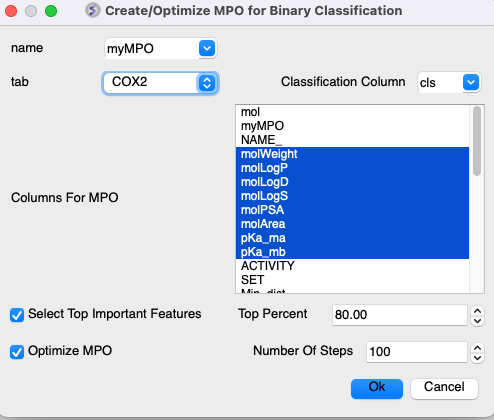 Workflow for MPO Binary ClassificationOpen the menu - go to Chemistry/MPO/Create/Optimize MPO for Binary Classification1. Select the Classification ColumnChoose the binary column (e.g., 'cls' with 1 for active and 0 for non-active).