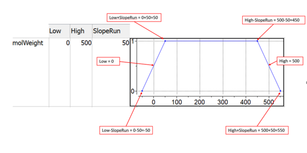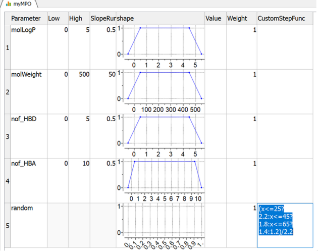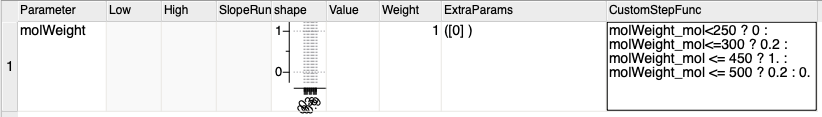 Another step function example molWeight_mol<250 ? 0 : molWeight_mol<=300 ? 0.2 : molWeight_mol <= 450 ? 1. : molWeight_mol <= 500 ? 0.2 : 0.
