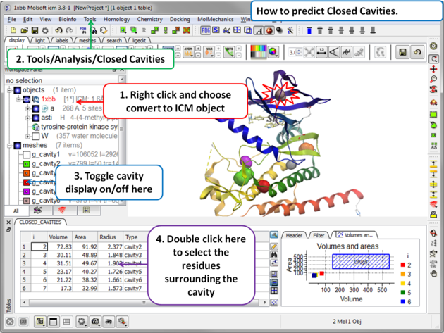 What is the difference between Closed Cavity and ICMPocketFinder? Closed pocket (cavityFinder) is purely geometrical/topological - it is a part of molecular surface that is completely disconnected from the exterior surface. It means that a probe sphere of 1.4A radius (representing a water molecule) can not pass in or out of the cavity (considering protein as completely rigid of course).
