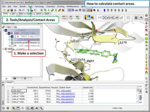 - A table as shown below will be displayed.The table lists the contact area, exposed area, percentage of contact area compared to exposed, the nearest atom of a residue and the distance.