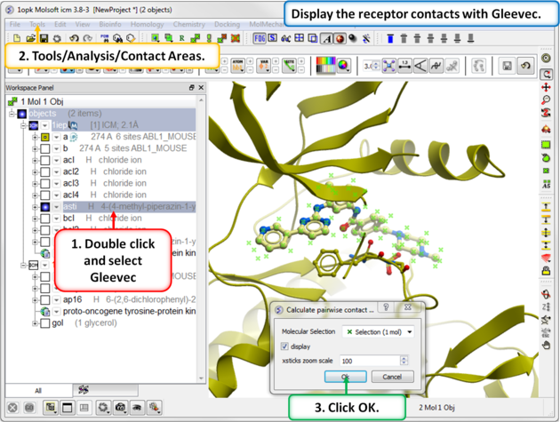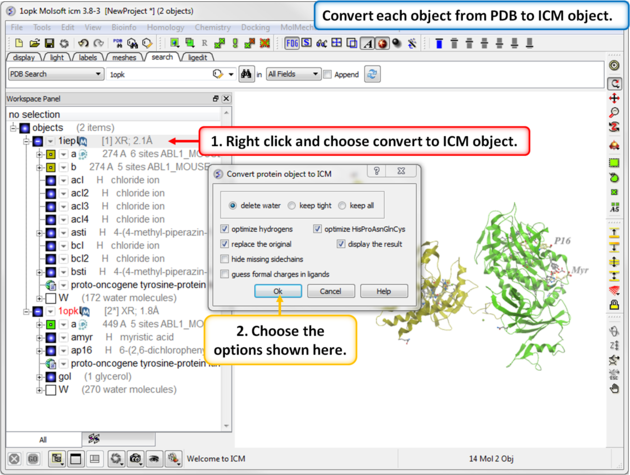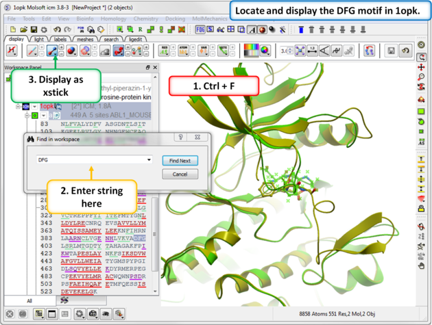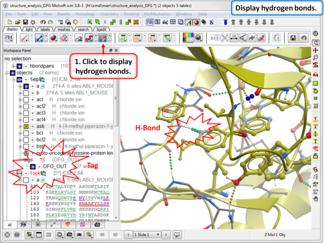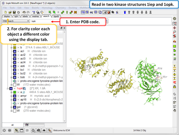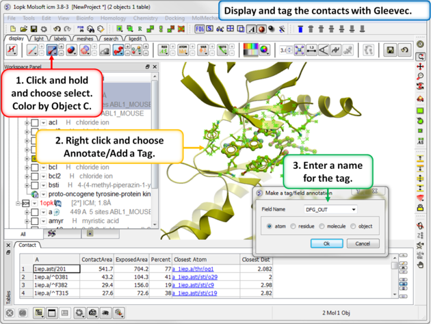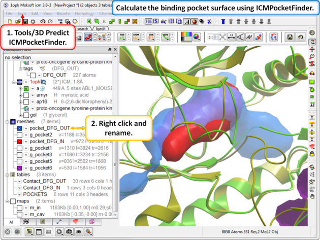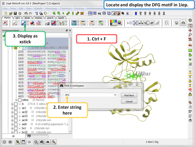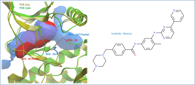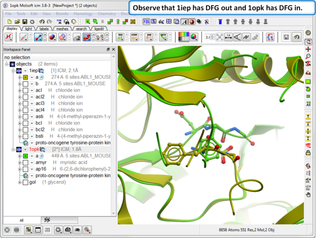 TutorialIn this example we will look at two kinase structures and compare their binding pockets. One of the structures is bound to the Type-II inhibitor Imatinib (Gleevec) a drug used to treat Chronic Myelogenous Leukemia. We will use ICM tools to look at the side-chains that interact with the inhibitor and compare the pocket with a DFG-in structure using ICMPocketFinder. Please click on the links provided to learn more about the methods used.