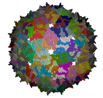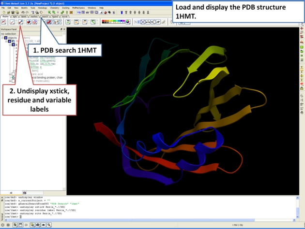 Objective Here we will investigate the biological environment of a virus protein . PDB code 1DWN. Background It is very useful to know how a protein from the PDB may look in a biological environment. The PDB entries solved by X-ray crystallography and deposited in the PDB contain the information about the crystal structure rather than the biologically relevant structure. For example, for a viral capsid only one instance of capsid protein complex will be deposited and only one or two molecules of haemoglobin that is a tetramer in solution maybe deposited. In some other cases the asymmetric unit may contain more than one copy of a biologically monomeric protein. ICM reads the biological unit information and has a tool to generate a biological unit. Not every PDB entry has the biological unit information. Instructions