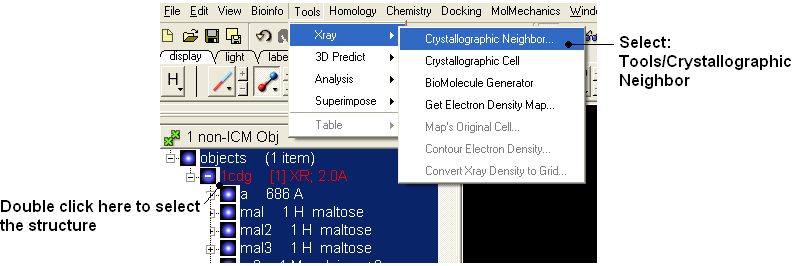 Background When inspecting a ligand binding pocket it is important to check that the true pocket is formed by chains which are not explicitly present in a PDB entry. Therefore it is necessary to use Tools/X Ray/Crystallographic Neighbor to find all molecules/subunits or chains involved in the interaction with the ligand. Molecular objects and 3D density maps may contain information about crystallographic symmetry. It consists of the following parameters: