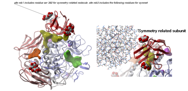 Example As an example let us look at Cycloldextrin glycosyltransferase (PDB Code: 1CDG). The problem with docking to this receptor is that the true pocket is formed by chains which are not explicitly present in the PDB entry. Site mb1 includes serine 382. This cannot be predicted just by looking at the structure. Therefore we need to identify symmetry related molecules to this protein.