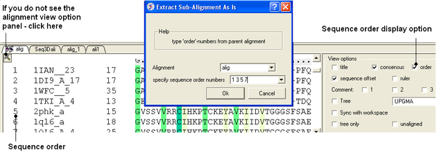 - Specify the sequence order numbers you wish to extract - enter each number separated by a space.You can see the sequence order alignment number by selecting