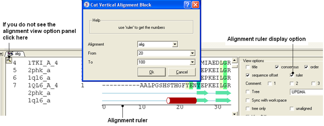 - Enter the region of the alignment you wish to cut (from: to:). The easiest way to determine the region to cut is to display the ruler in the alignment. This