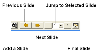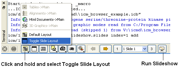 You can make as many slides as you wish as described in the Making Molecular Slides section. To navigate through the slides you can use the buttons shown below, the cursor keys for some operations or the right click options in the ICM Workspace.