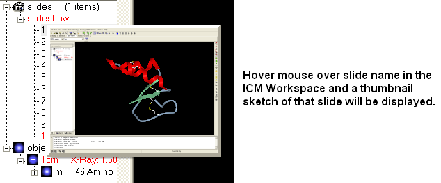 To jump to another slide right click and select "Set Slide". All slides are displayed in the ICM Workspace. You can hover the mouse over a slide name in the ICM Workspace and a thumbnail sketch of the slide is displayed as shown below. This can be used for slide navigation purposes.
