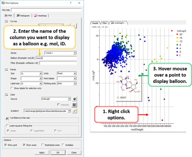 - Enter the name of the columns containing the data you wish to display in the balloon (e.g. mol, ID).