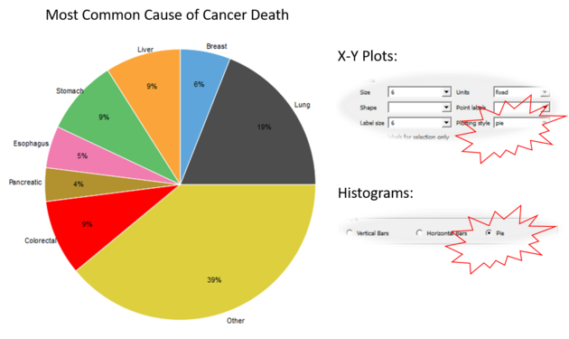 - For Histogram choose Plotting Style > Pie radio bin. Number of bins/sectors can be controlled the through the 'Bin Size' parameter. For Plots choose Points > Plotting Style > Pie 'X' should be discrete (integer or string column with categories), 'Y' - any numerical column.