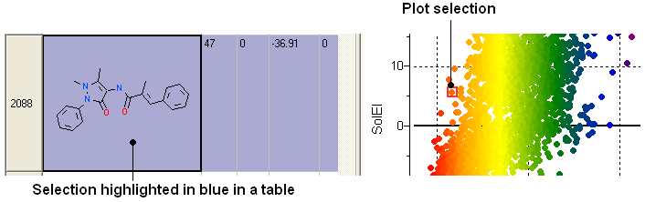 All selections are directly linked to the table from which the plot was made. Selections in the table are highlighted in blue.
