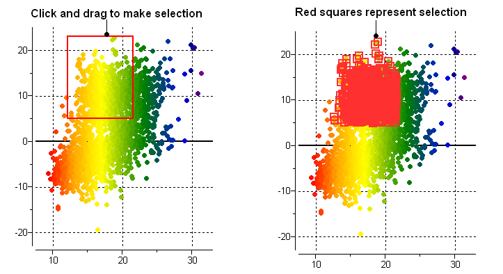 - Click and drag in the plot to make a selection. Individual points can be selected with a single click.