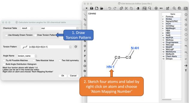 • Sketch a torsion pattern by marking four torsion atoms with labels 1-4 e.g [c:2]([c:3]:[n:4]):[n:1] Labels can be set as shown in the molecular editor below - right click on an atom and choose 'Atom Mapping Number'.