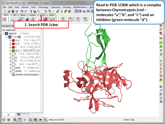 Step 1: Read in the Chymotrypsin-Inbibitor complex (PDB: 1CBW). Notice that the inhibitor (green) interacts with three molecules of chymotrypsin (red).
