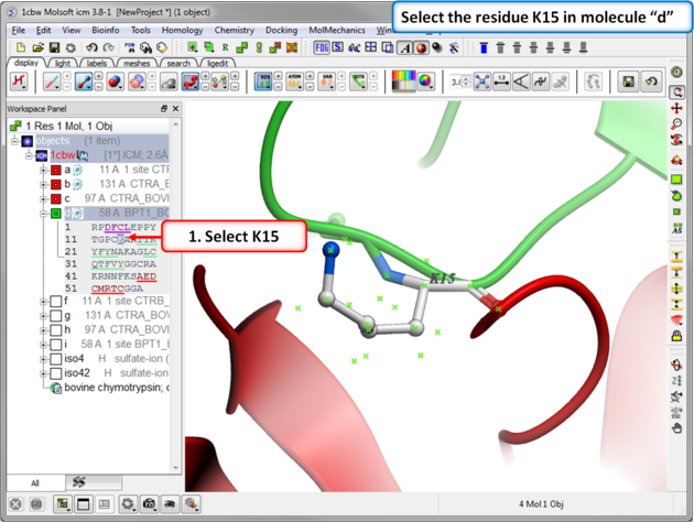 Step 2: Select the residue to mutate. Select residue K15 in the inhibitor - molecule "d".