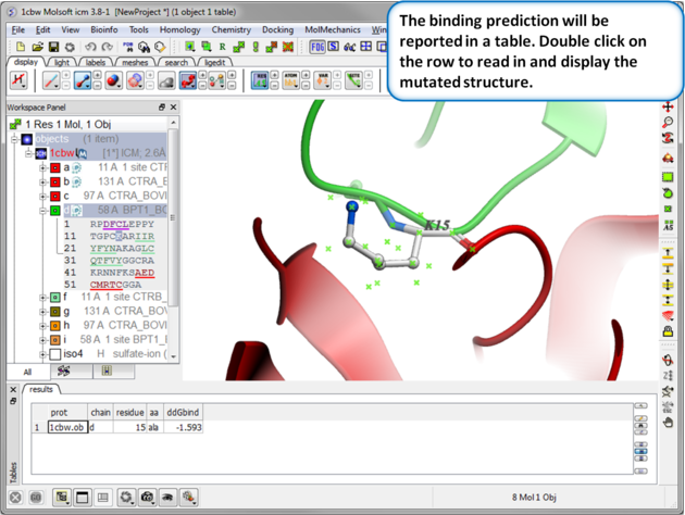 Step 5: Results. A table reporting the binding free energy in kcal/mol (ddGbind) will be displayed. Double click a row of the table to load and display the mutated structure.