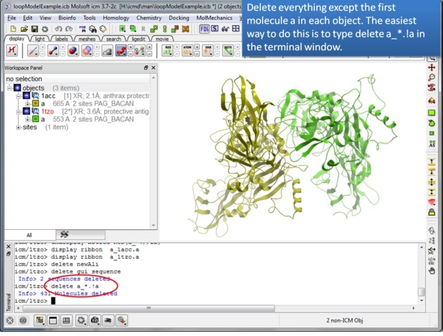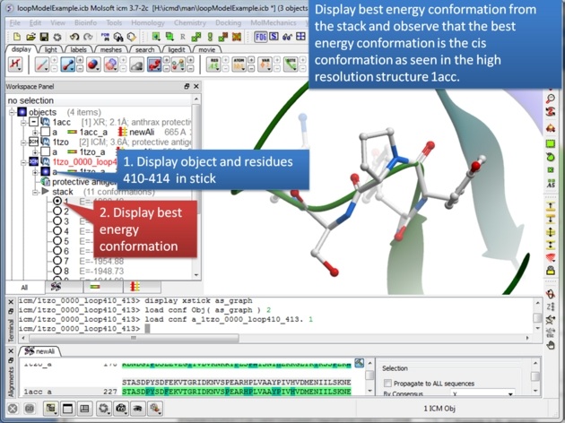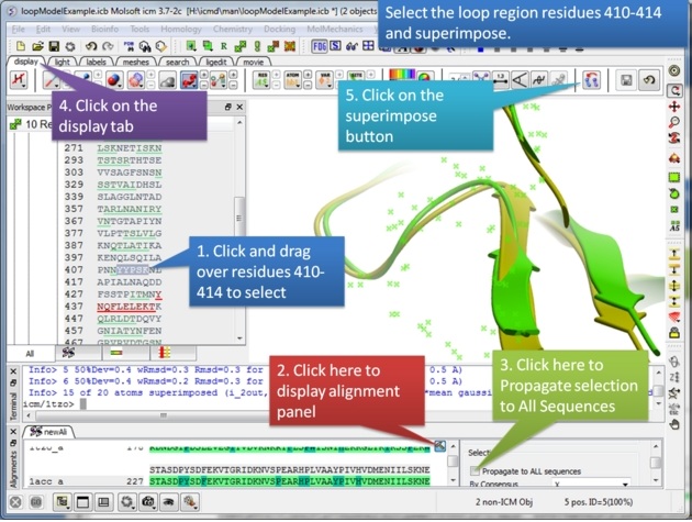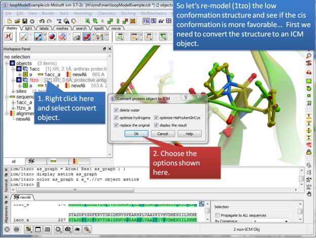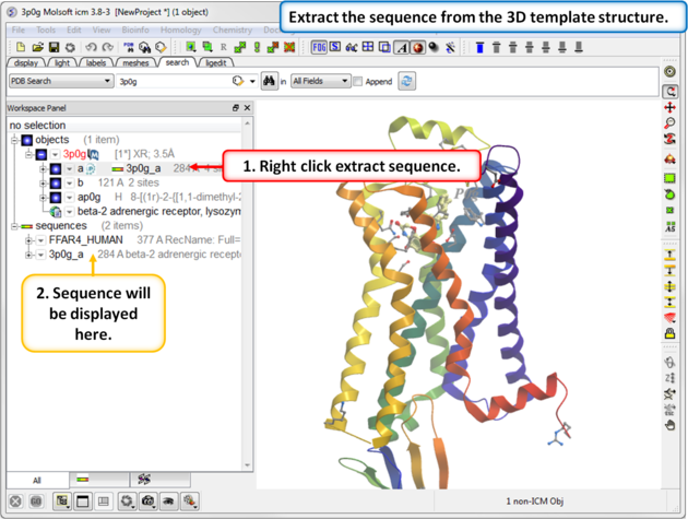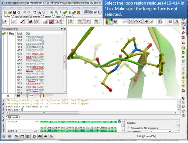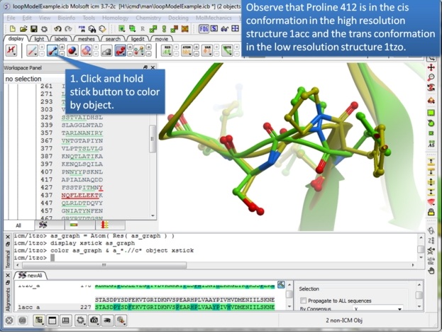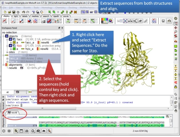 Step 3: Extract hte sequences from both receptor by right clicking on the molecule in the ICM workspace. The alignment makes it easier to superimpose the loop and select the loop in both structures.