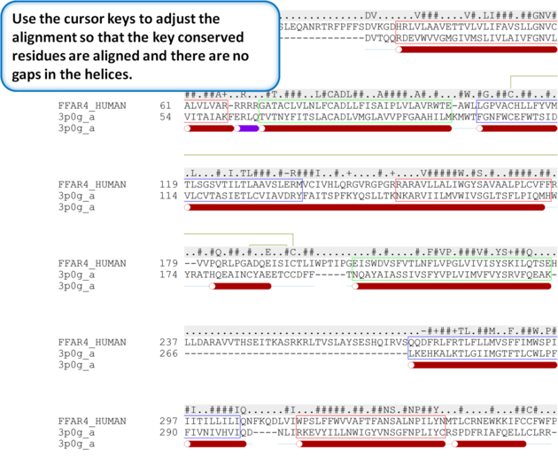 Step 5: Use the cursor keys to adjust the alignment so that the key conserved residues are aligned and there are no gaps in the helices.