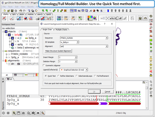 Step 6: Choose the option Homology/Full Model Builder. Use the Quick Test method first to inspect the quality of the model-sequence alignment.