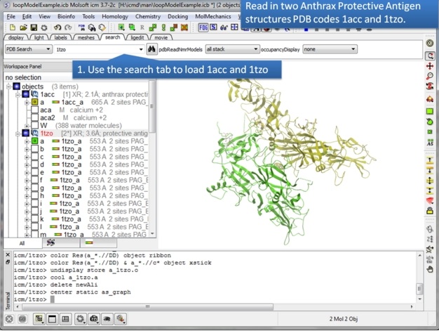Step 1: Use the search tab to read in two pdb structures 1acc and 1tzo.