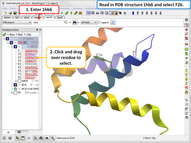 Step 1: Read in PDB 1hb6 and select residue F26.