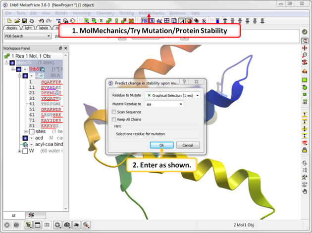 Step 2: Choose the menu option MolMechanics/Try Mutation/Protein Stability and choose Ala mutation.