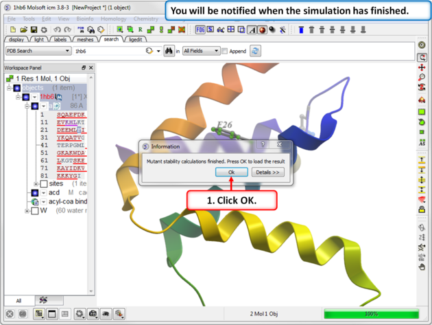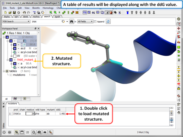 Step 5: The predicted ddG value should be close to the experimental value of 1.54kcal/mol. Double click on the results table to load and view the mutated structure.