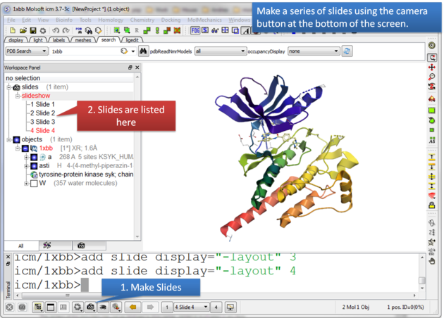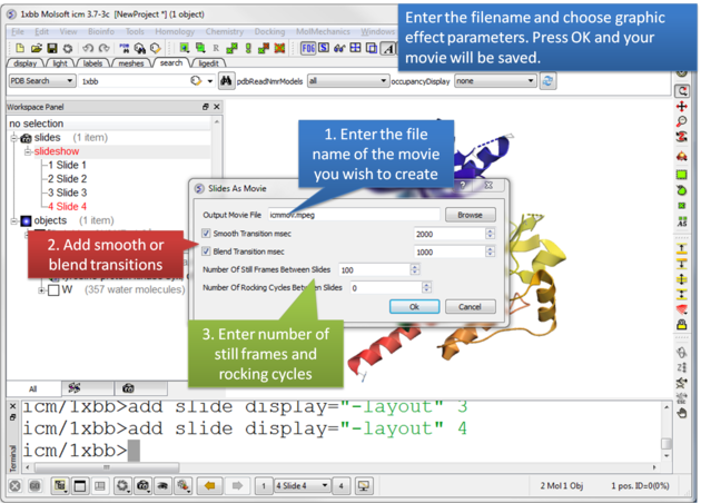 NOTE: Anything you do in the graphical display will be recorded in the movie. For example you can change representations, lighting, add new molecules etc. This can be achieved in a more controlled manner using the pause and record smooth transition button.