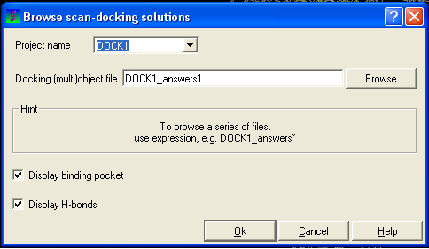 - You can display the binding pocket or the H-bonds by selecting the appropriate boxes in the Browse scan-solutions data entry window (shown above).