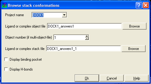 - Enter the name of the icm conformational stack files with multiple docked conformations into the Ligand or complex stack file data entry box. This file will be called PROJECTNAME1_1.cnf . The browse button can be used to search for the correct file. The second solution in the stack can be viewed by changing the number 1 at the end of the file name to 2 (PROJECTNAME1_2.cnf) and so on for each solution in the stack.