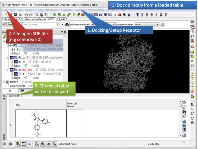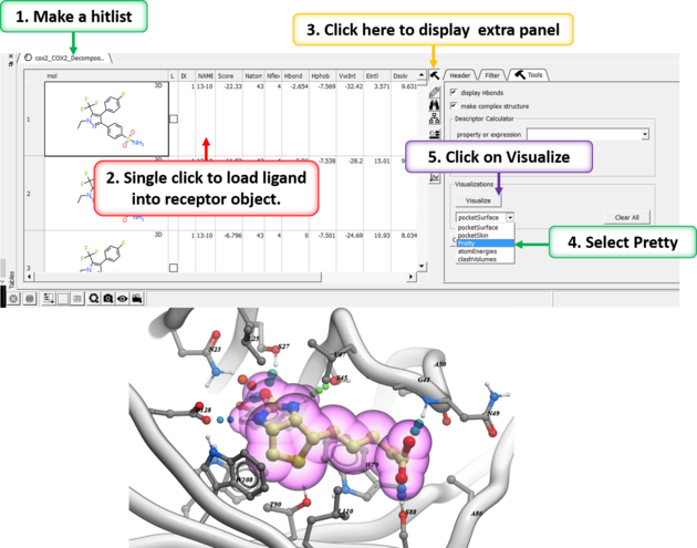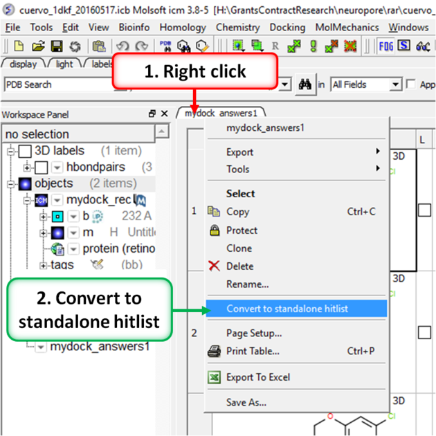 - Single click on one row of your hitlist to load the ligand (usually labeled m) into the receptor object (_rec object).