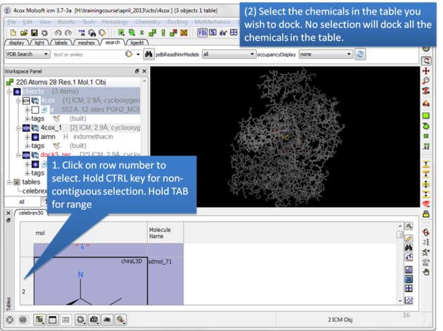 | Select the chemicals in the table you wish to dock. If no selection is made ICM will dock the whole table. You can make selections by clicking on the row