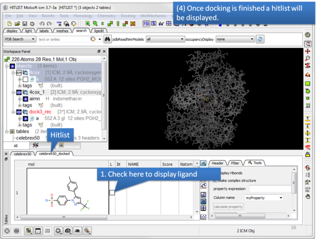 - The options keep and stop and retain will retain the displayed ligand in the graphical user interface. If you want to export the docked complex as a PDB file you will need to move the ligand and receptor into one ICM object.