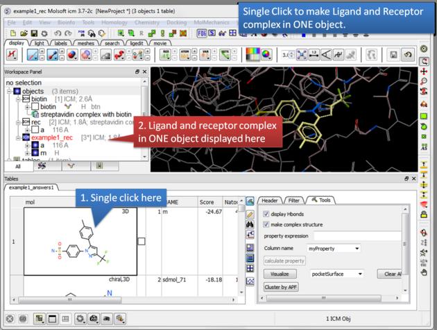| Single click. A single click on a row in the hitlist will load the ligand and receptor complex in one object. |
