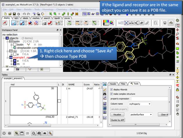 | Save a complex as a PDB file. If the ligand and receptor are in the same object you can save them both as a PDB file. Right click on the name of the complex in the ICM Workspace. Select "Save as" and then a