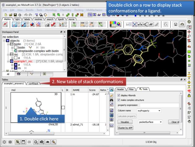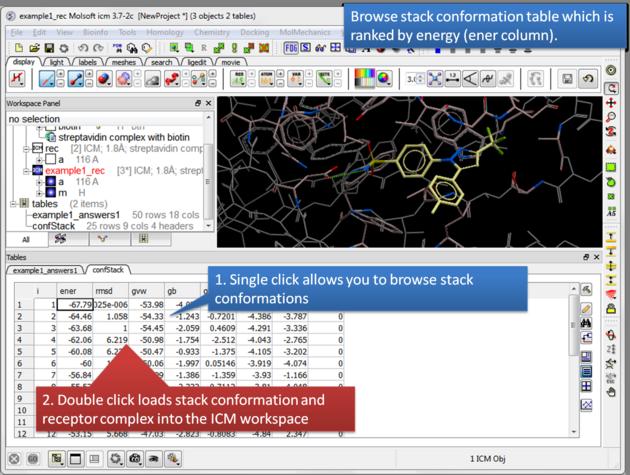 | Browse stack conformations. Single click allows you to browse (or use up/down arrow keys) and double click generates complex in the ICM workspace. |