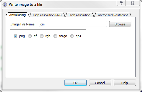 A quick image can be saved using this option. The image will be saved as icm1.png in the current directory in which you are working. Each subsequent image produced will be incrementally numbered.