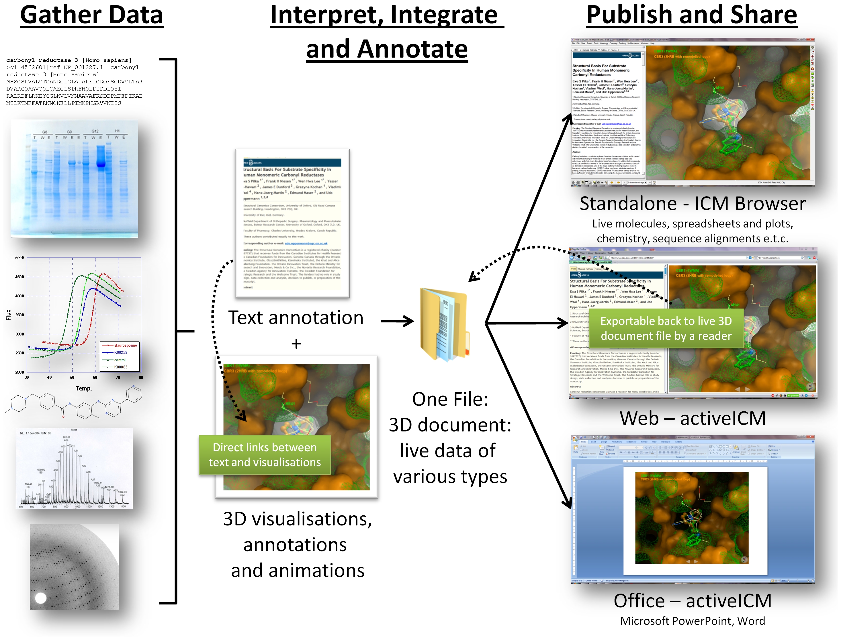 Inside a single file you can save and display many different data types such as sequences, alignments, plots, tables, protein and DNA/RNA structures. Each data element can be linked to one another and annotated and then shared via the web, MS Office tools or in the free ICM-Browser. Pharmaceutical and biotech companies use ActiveICM to share data between scientists in different disciplines. Academic laboratories such as the SGC publish their data to the world using ActiveICM in a web browser.